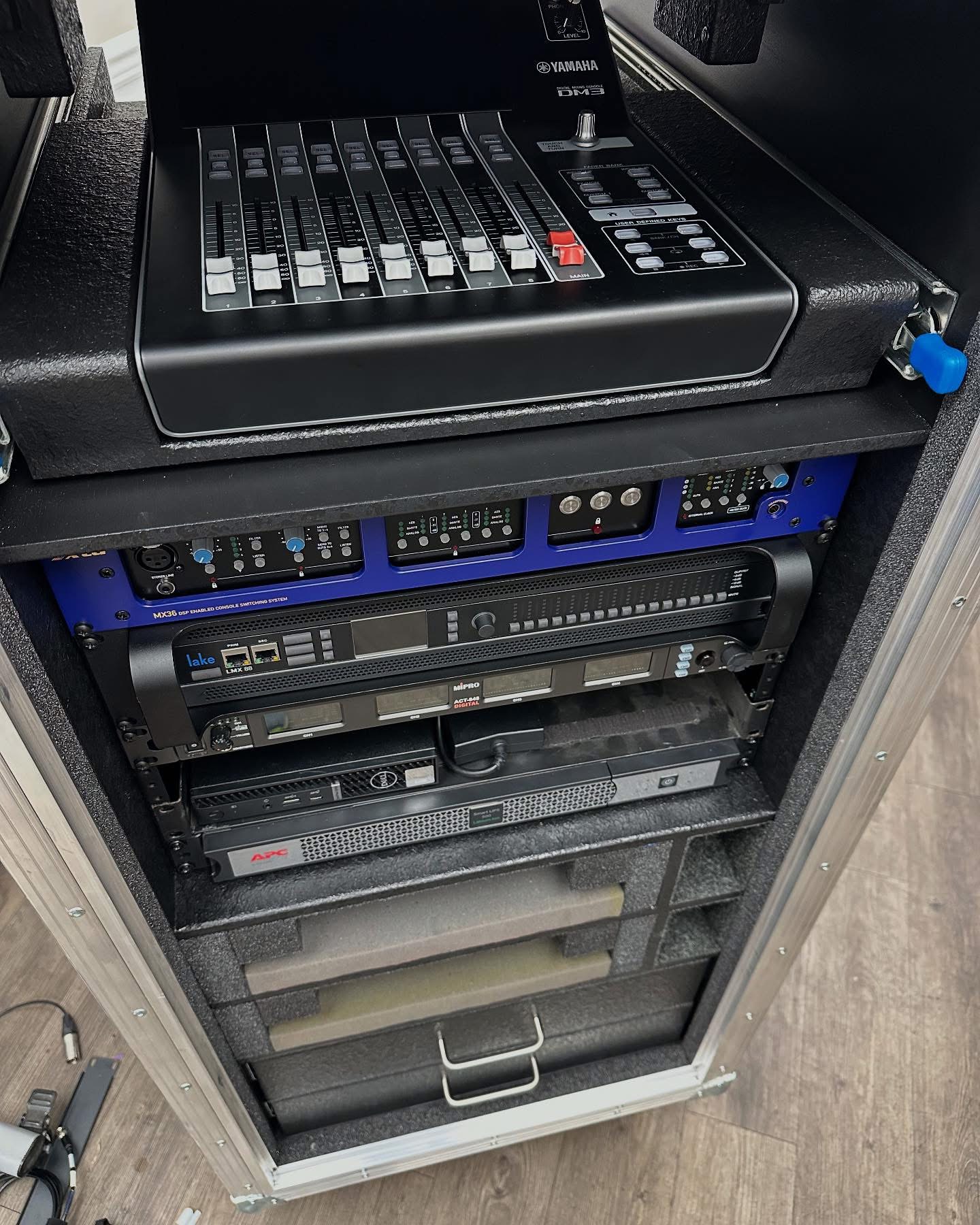 The drive system for this tour was fully digital front to back. The console drive was taken in AES3 through a console switcher (XTA MX36), where it was passed over a Dante network to the system processor (Lake LMX88), and down to each amp rack, where it was converted back to AES3 by D&B DS10 converters and distributed to the amplifiers. This network was fully redundant and backed up by a fully analog third stage of redundancy. Additionally, the drive system contained the measurement rig for the tour. Measurement was all done in Rational Acoustics Smaart, with 4 channels of wireless measurement mics (EMX7150 measurement mics, wireless with MiPro ACT848), and distributed through the measurement rig over Dante by a Yamaha DM3D.